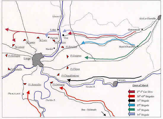 Las primeras tropas alemanas llegaron a los alrededores el mismo día en que cruzaban la frontera, haciendo saltar por los aires la neutralidad belga. Al día siguiente, el 5 de agosto, ya la tenían rodeada y, para el día 7, quedaba oficialmente bajo control teutón. Pero ese día sólo conquistaron la ciudad, pues la docena de fortalezas que la rodeaban continuó en manos belgas unos días más, resistiendo heroicamente los embates de un sorprendido invasor que pensó se rendirían en 48 horas como máximo. De hecho, todos los ataques habían sido rechazados gracias al cruce de artillería sincronizada desde los doce fuertes, infligiendo a los alemanes numerosas bajas. Cada ejército alemán, sin importar su posición en el perímetro, estaba expuesto al fuego de al menos dos de las fortalezas, construidas en su mayoría bajo tierra, lo que obligaba a sus comandantes a dividir el fuego.