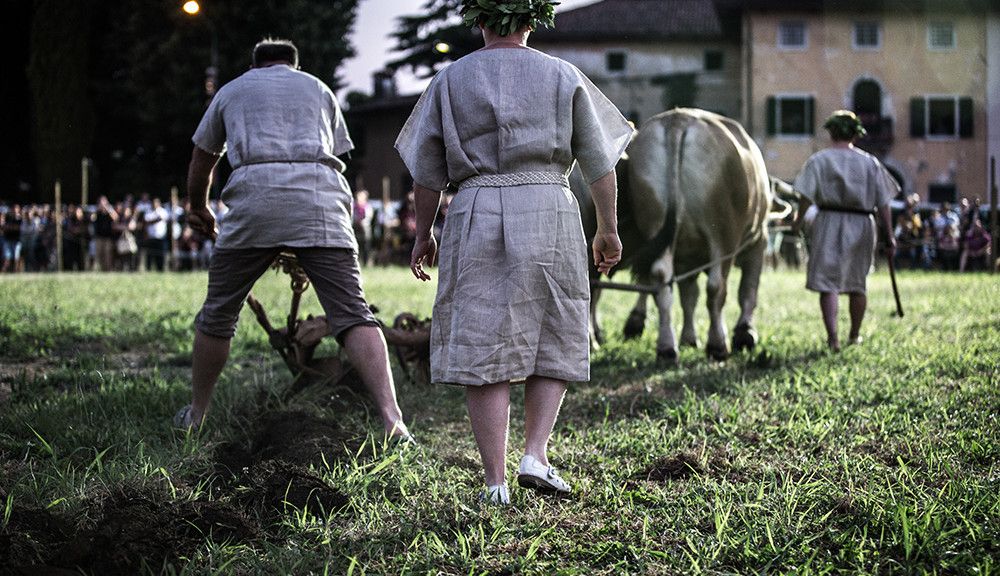 Necesitáis dos reses, un toro y una vaca, blancos y que nunca antes hayan llevado el yugo, de preferencia, que para eso los romanos eran muy prácticos. Engancháis animales a un arado de bronce, el toro, símbolo de la